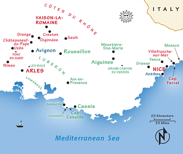 This magnificent region is shaped like a giant wedge of quiche. From its sunburned crust, fanning out along the Mediterranean coast from the Camargue to Marseille, it stretches north along the Rhône Valley to Orange. The Romans were here in force and left lots of ruins — some of the best anywhere. Seven popes, artists such as Vincent van Gogh and Paul Cézanne, astrologer/physician Nostradamus, and author Peter Mayle all enjoyed their years in Provence. This region features a splendid recipe of arid climate, oceans of vineyards, stunning scenery, lively cities, and adorable hill-capping villages.