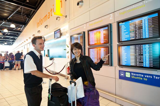 There are two separate terminals (know your terminal — check your ticket or the airport website). Terminal 1, a multi-level maze of check-in counters and shops, is linked to the train station. Terminal 2 is small and quiet, with few services. The SkyLine people mover connects the two terminals in less than five minutes. Several staffed info desks are sprinkled around the airport; keep an eye out for one of the freestanding kiosks that immediately connect you to a free video call with an airport-info staffer.