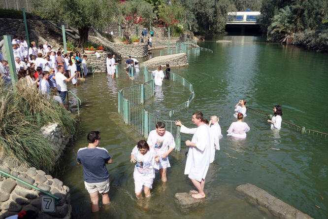 Another sight near the sea also has great significance. According to tradition, John the Baptist baptized Jesus where the Jordan leaves the Sea of Galilee. Today, many Christians flock to a spot on the Israeli side of the river called Yardenit to be baptized or rebaptized. There are competing baptismal spots farther south on both the Israeli-controlled and Jordanian sides of the river. I found Yardenit the most lively...but the least spiritual.