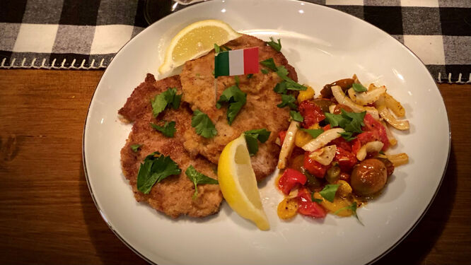 While traditionally done with a boneless veal cutlet, it’s also common to use a thin chop on the bone. Either way, the veal must be pounded thin before cooking to tenderize the meat. The cutlet you begin with (whether with the bone or not) is not a thin strip like a scallopina, but larger — at least the size of a large hand. Try to find a butcher who will cut the meat properly.