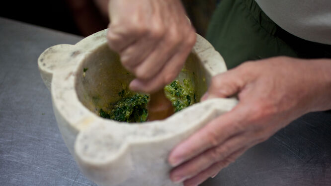 Once upon a time, pesto was invariably made by hand using a mortar and pestle; in fact, the name implies the act of using the pestle. This is still the classic and preferred method, but these days, even much of the pesto consumed in Liguria is made in a blender. Handmade pesto is still better, because the ingredients have been worked less, but blender pesto is fine as long as you use the finest, freshest ingredients available.
