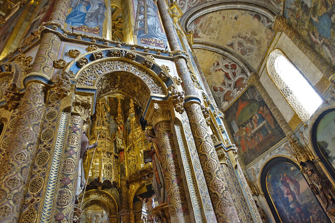 The Convento de Cristo's interior gives a glimpse of the mystical wonder of the Knights Templar. The original castle and oratory were built when such impressive architecture was new in Europe. The oratory was designed so horses (important in the Templars' success on the battlefield) could be ridden in and blessed. Later, under Portuguese King Manuel I, a big conventional church was added. The oratory's wall was cut open to connect the church and the oratory with a grand, triumphal arch. The church's nave is decorated in the incredibly intricate Manueline style — motifs that pay tribute to the sea trade that made Portugal rich. Ornamental shields and coats of arms are decorated with castles, crosses, lions, flags, and crowns. There are even designs that duplicate ropes used on ships during Portugal's Age of Discovery.